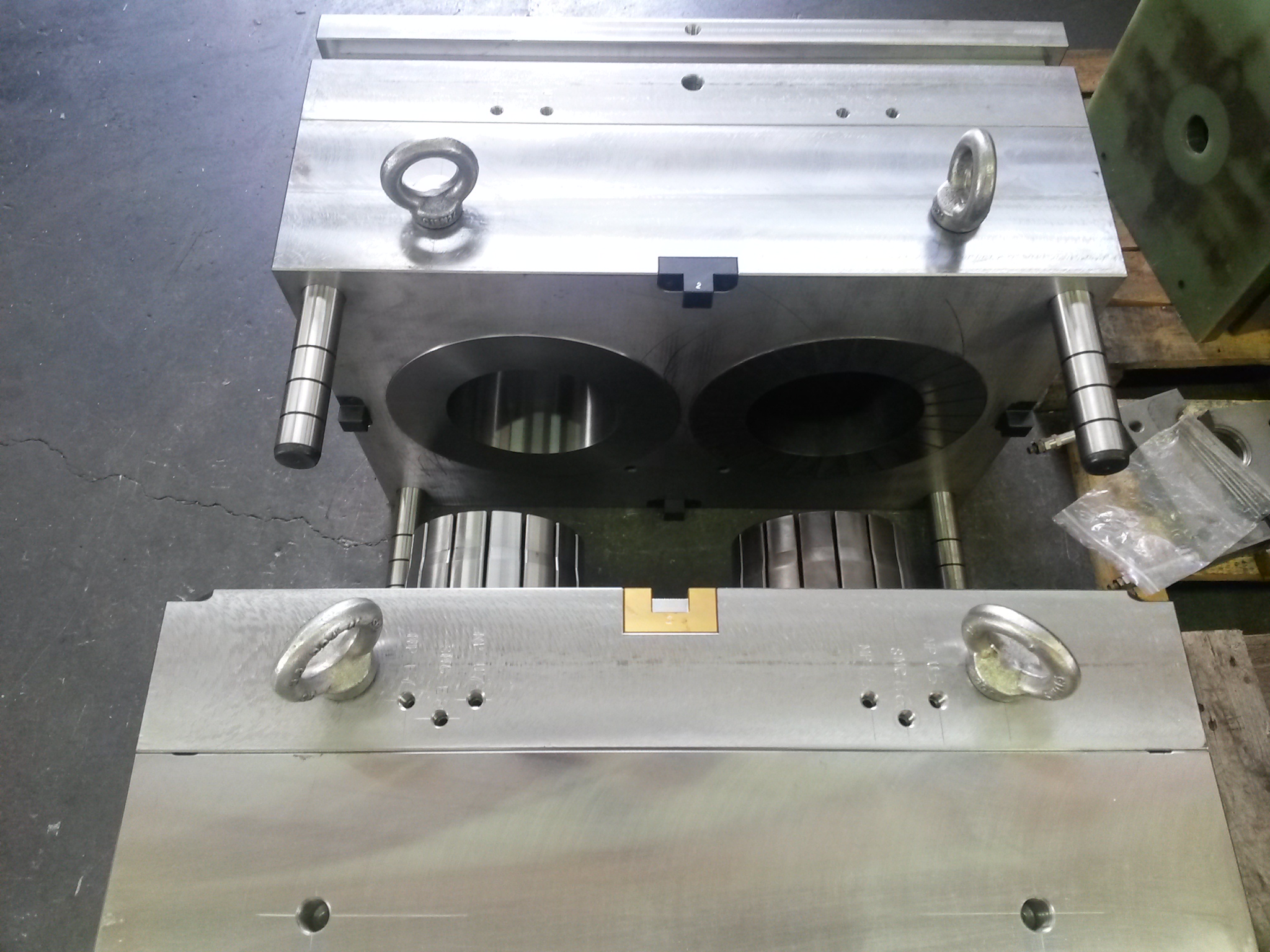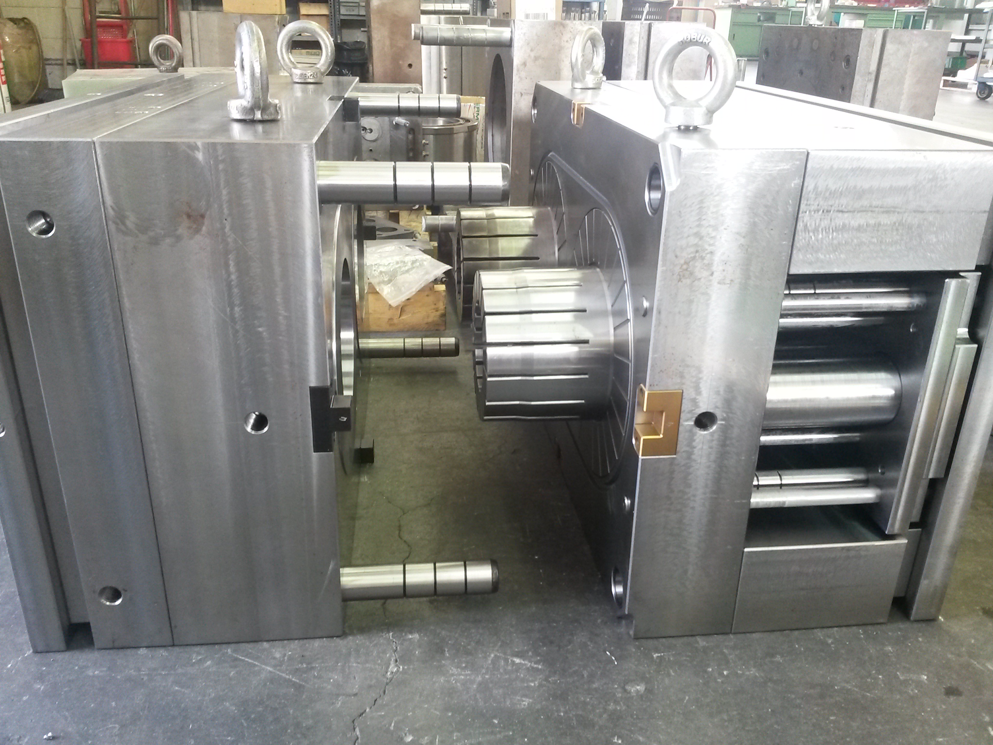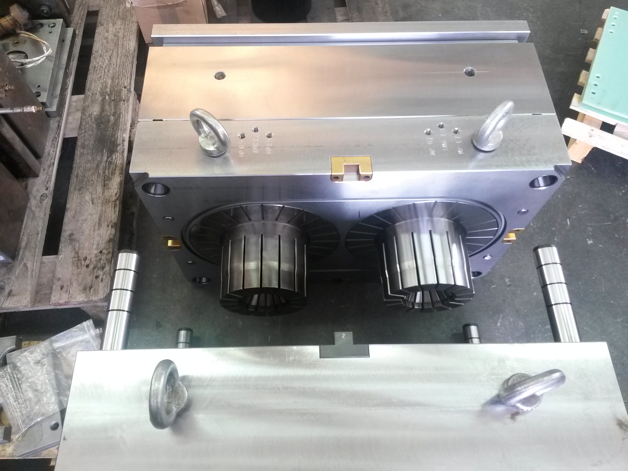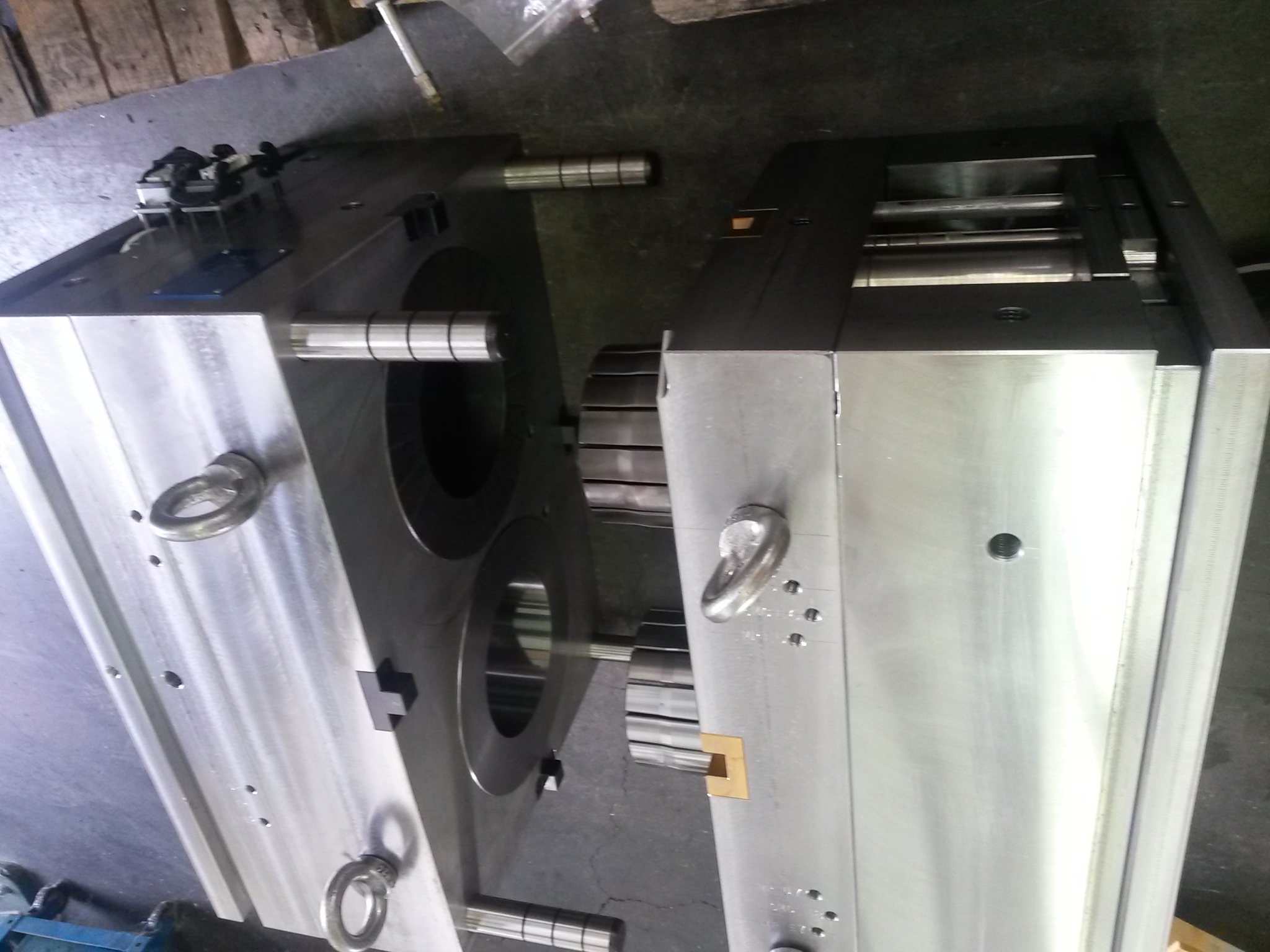 In particolar modo abbiamo stampi (fatti da altri) in riparazione ed altri pronti per la consegna, stampi per plastica a 2 impronte e stampi doppi orizzontali.